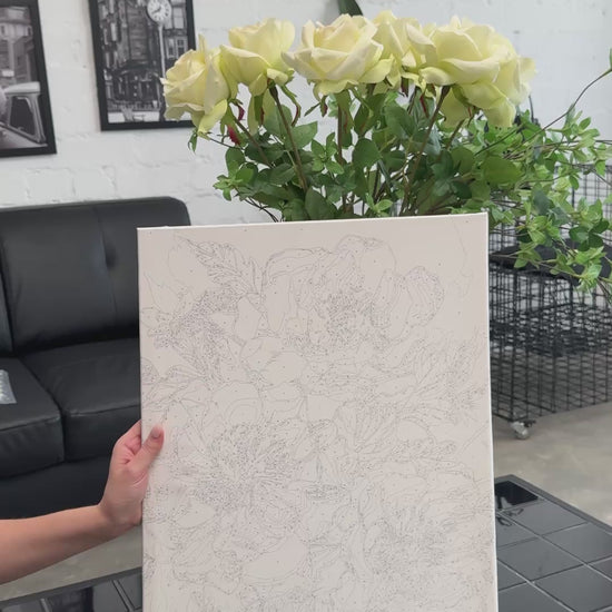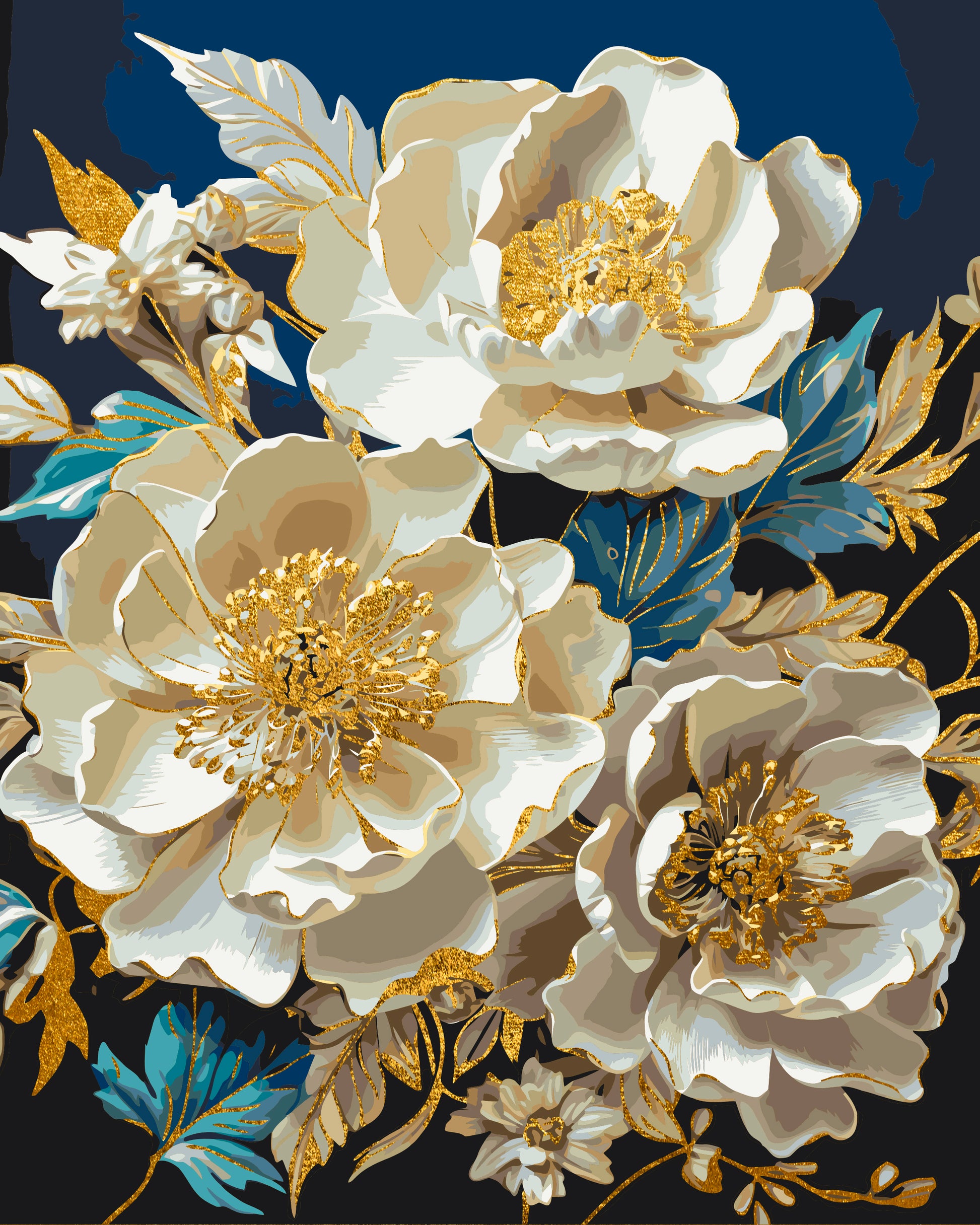 Maľovanie podľa čísel Kvety. Bielé pivónie s metalickými farbami zlato 40*50 cm LW 30410